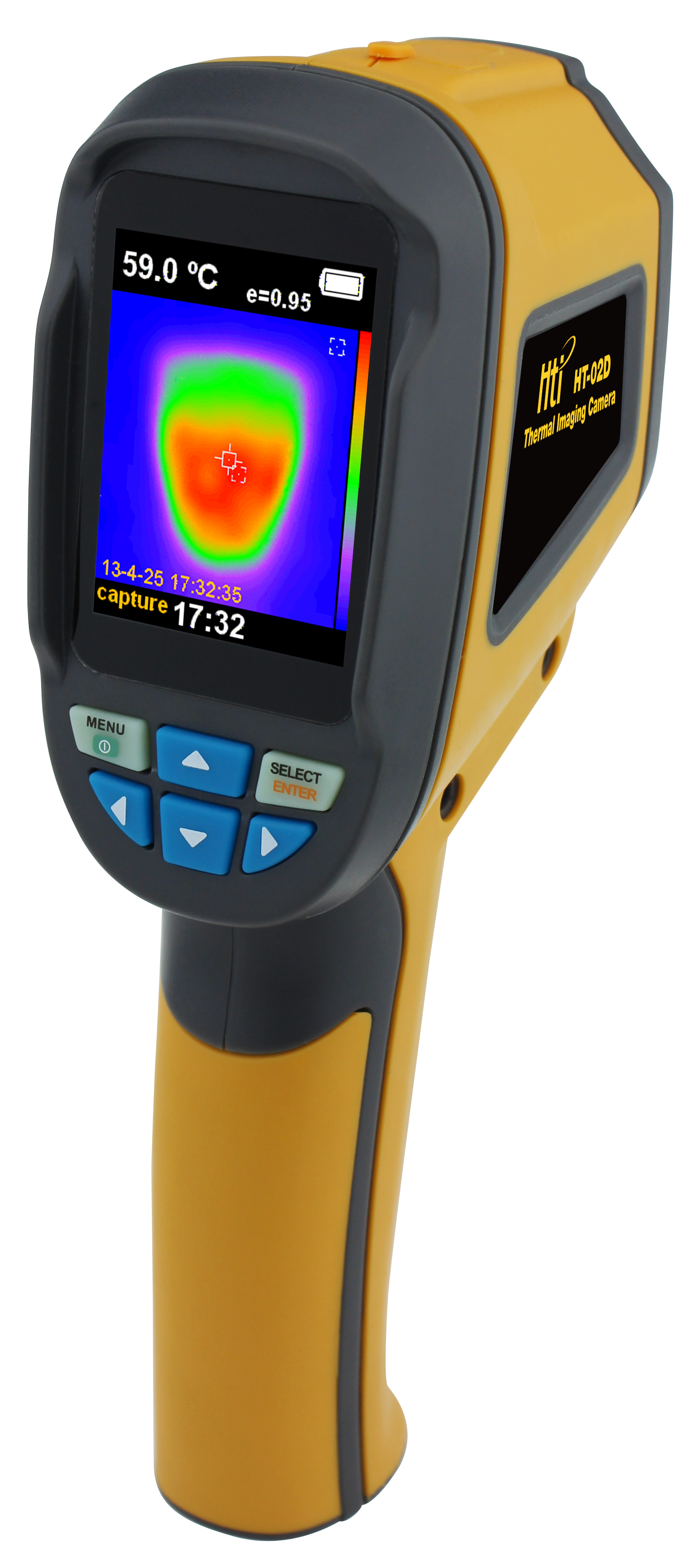 HT 02D 手持式红外热成像仪采用32×32基础分辨率传感器,集成彩虹、铁红、高对比度彩虹、白热、黑热五种伪彩模式,通过智能算法优化成像效果。专为日常测温场景设计,是家庭用电检查、小型设备维护的入门级热成像工具。